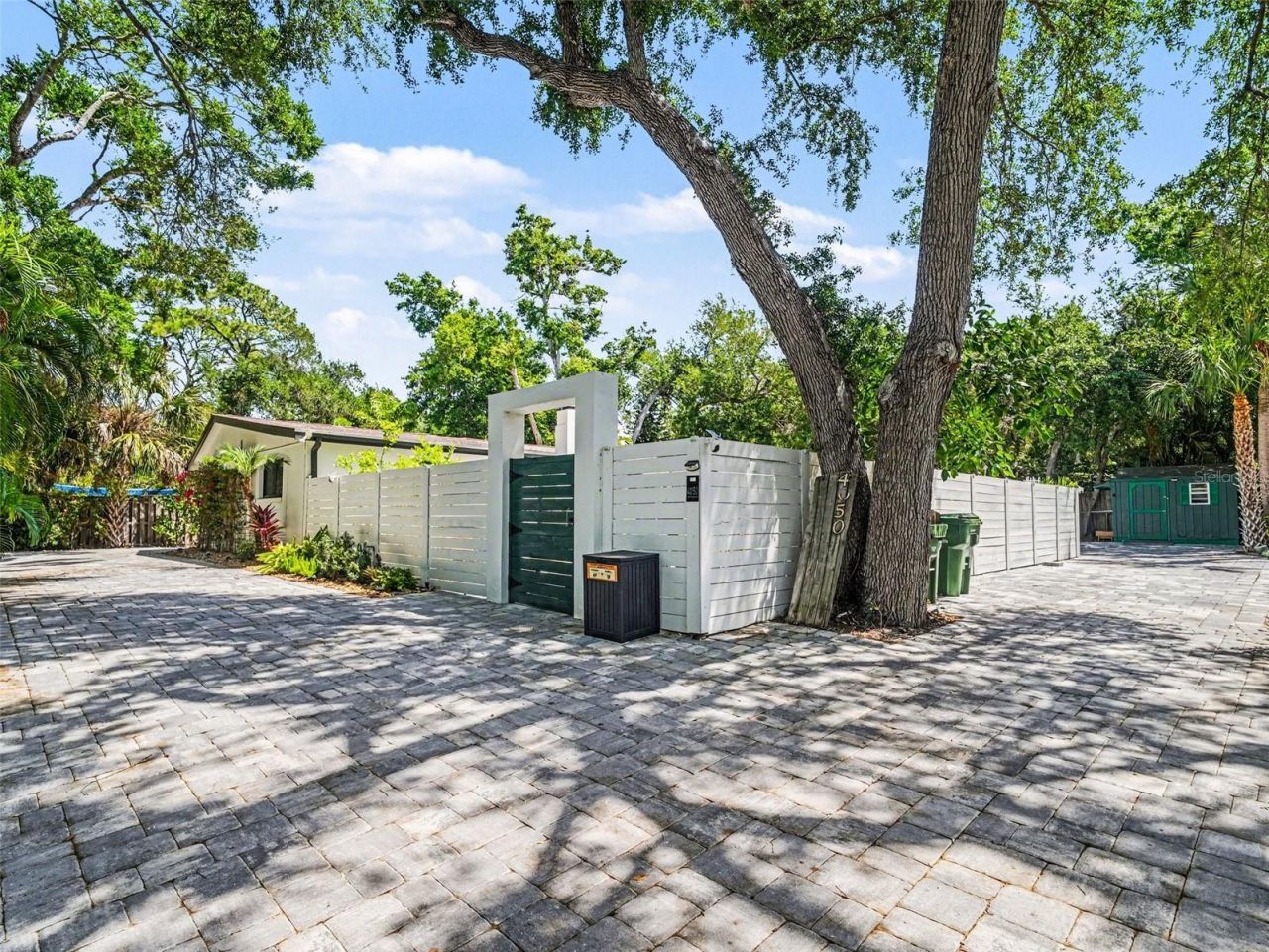 Step into a home that redefines privacy, design, and sophistication. Priced at $870,000, this fully renovated 3-bedroom, 3-bathroom residence with a dedicated office and pool offers a rare courtyard-style layout where indoor and outdoor living seamlessly intertwine. Enter through a private gated front courtyard, and you're immediately welcomed by a heated pool, custom pavers, and a striking outdoor wood-burning fireplace. Cement planters with cushioned seating surround the pool, creating a relaxed resort-style setting, while a lemon tree and foliage add a natural, tranquil touch to the courtyard oasis. This is an intimate, resort-style setting designed for both private entertaining and everyday living. The oversized screened lanai extends your living space even further, creating multiple areas to relax and unwind in complete privacy.Inside, modern upgrades marry timeless design across a beautifully connected living and kitchen layout. The living room is anchored by a sleek electric fireplace and a mounted picture frame TV against a green tile backsplash, creating a refined focal point that feels both comfortable and elegant. The kitchen is equally impressive, featuring quartzite countertops, floor-to-ceiling custom cabinetry, and a pot filler above the gas stove. Seamlessly integrated appliances, including a refrigerator concealed within matching cabinetry, enhance the clean, elevated aesthetic. A hidden 'secret door within the kitchen leads to a spacious laundry room and full bath, adding practicality while introducing a subtle element of surprise. The private office is another standout feature, finished with marble flooring and framed by large windows overlooking the courtyard and pool. Abundant natural light and serene views create an inspiring workspace, while French doors provide privacy when needed.New engineered wood flooring flows throughout the home, complemented by updated lighting and new hurricane impact windows and doors for peace of mind.This home offers the rare advantage of two primary suites, each refined in every detail. The main suite is a true retreat, featuring a private dry bar with a mini fridge, a fully customized 7x17 walk-in closet, and a spa-inspired bath with a soaking tub, expansive walk-in shower, heated towel rack, smart toilet, and designer finishes in warm, sophisticated tones. The second suite provides its own spacious bath and beautifully finished walk-in shower, ideal for guests or multigenerational living. The third bedroom has beautiful views of the pool through the sliding glass doors.Additional upgrades include a whole-home water filtration system, split A/C units for enhanced cooling, an attic fan, and new fencing surrounding the courtyard. Parking is abundant with a circular driveway and additional space alongside the fence, comfortably accommodating five or more vehicles. A separate outdoor shed provides convenient storage for lawn and pool equipment. Located in a quiet neighborhood just a few streets from the water, this home is a rare find in today's market, where every detail has been carefully curated for luxury, comfort, and style. Furnishing negotiable!